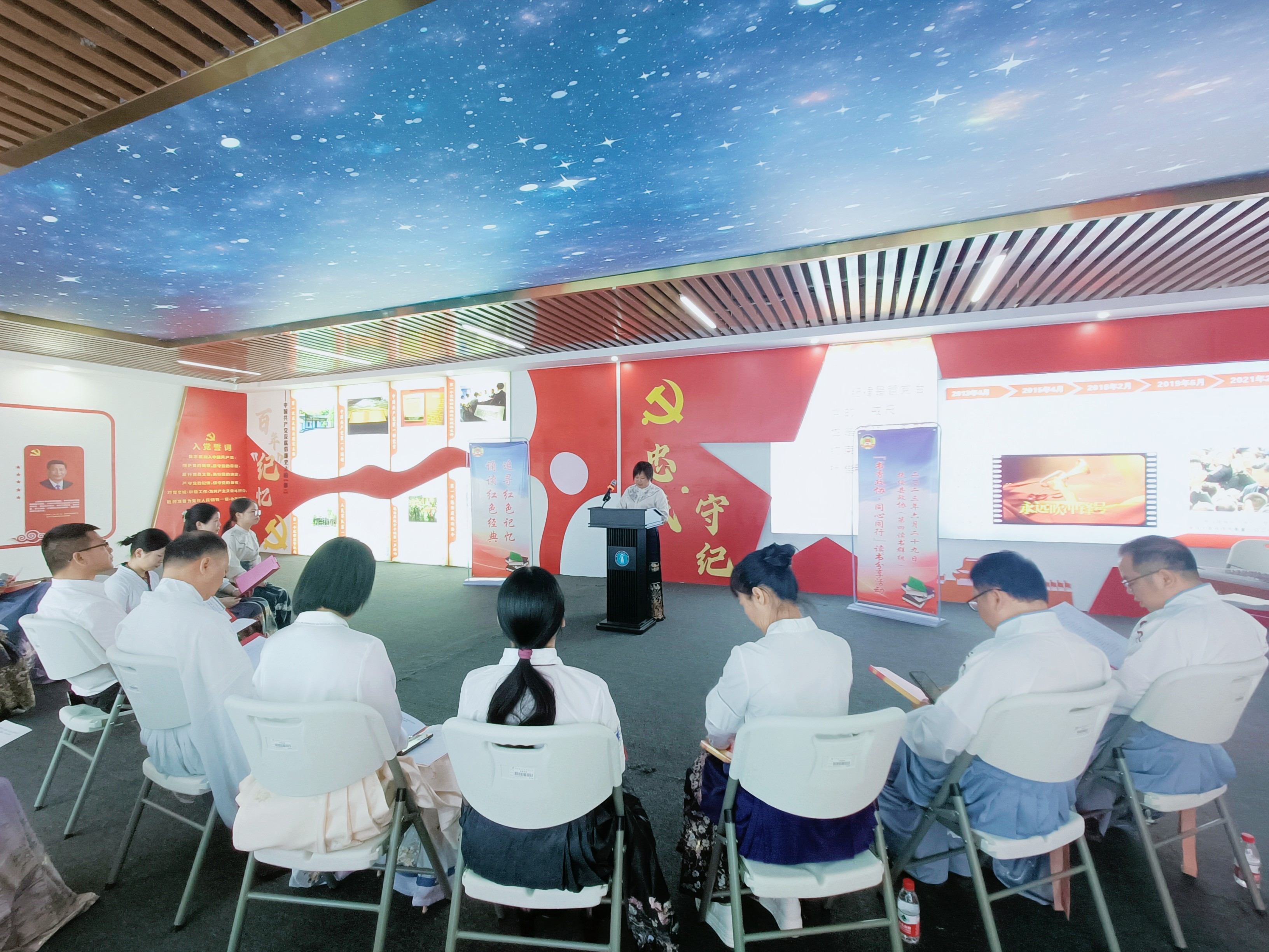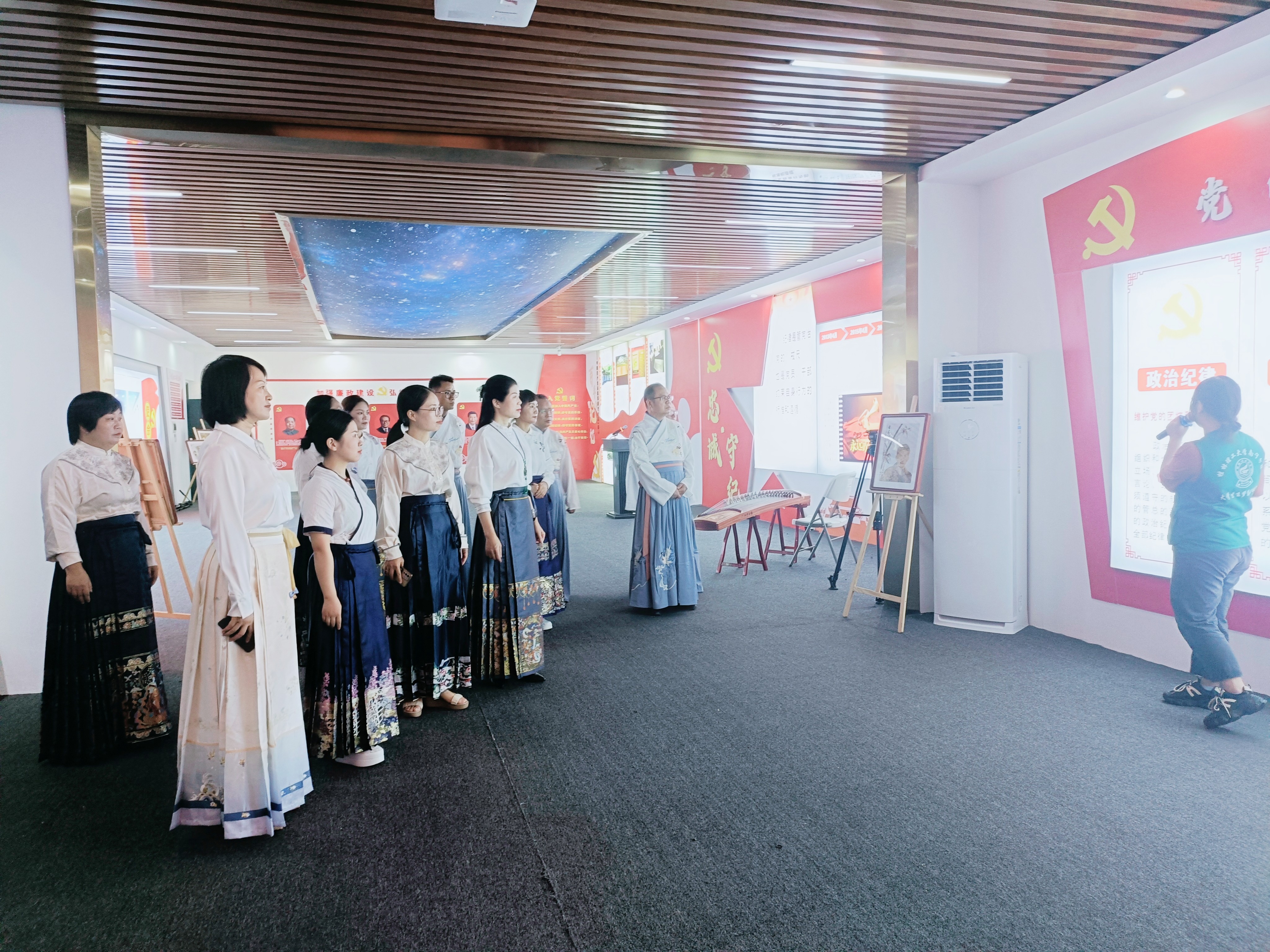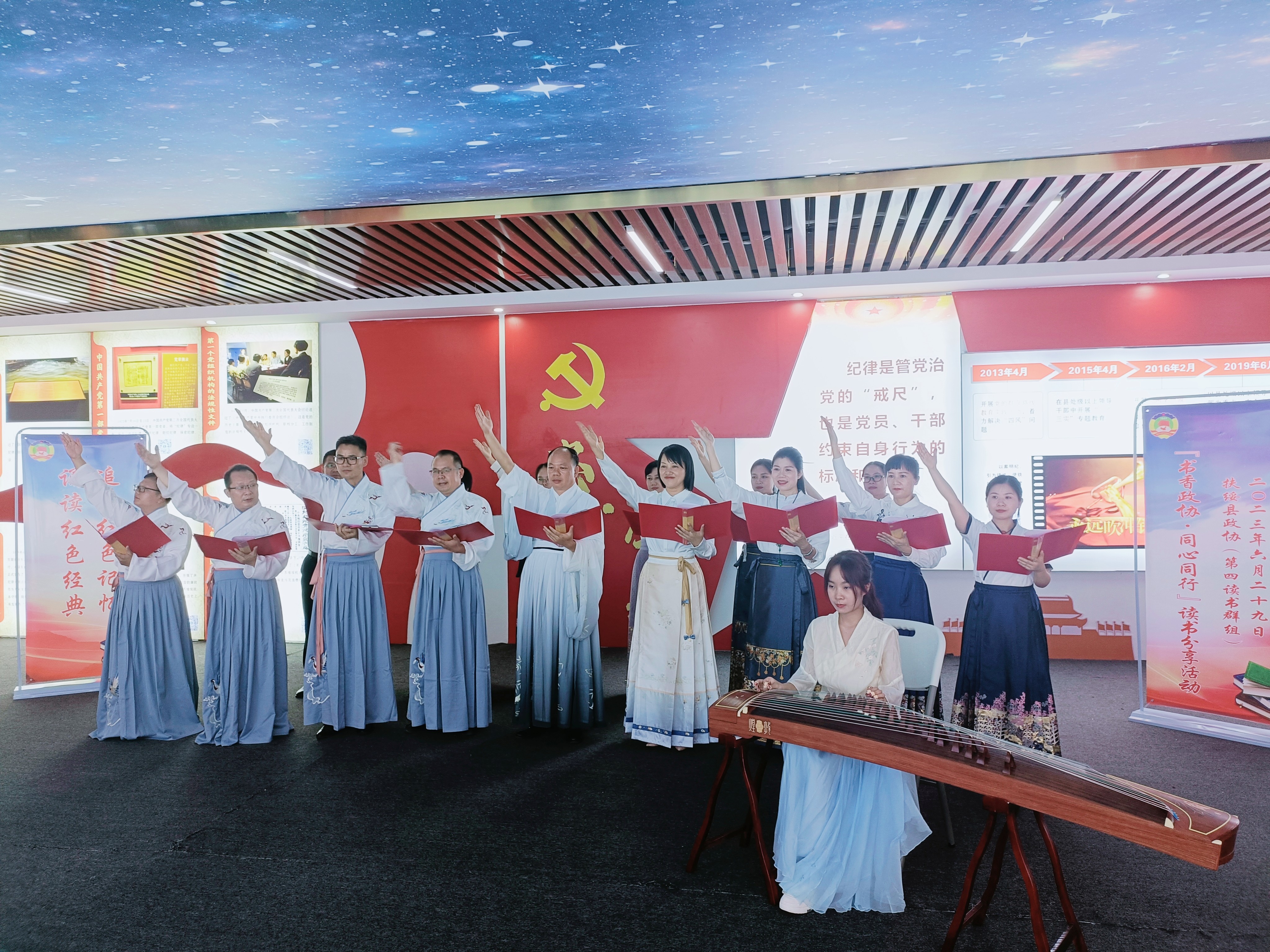 在活动中,身着国风元素服装的教育、妇联等界别的委员们兴致勃勃地参观了桂林理工大学(空港校区)的军事馆、廉洁馆、桂西南民俗馆。在参观学习中,委员们重温了中国共产党苦难辉煌的革命历程,缅怀英雄的丰功伟绩,追寻革命先辈的光辉足迹,学习革命先辈的崇高精神,从红色基因中不断汲取继续前行的精神力量。参观结束后,开展了精彩的读书分享活动,委员们纷纷上台对《苦难辉煌》等红色经典书籍的精彩片段进行诵读并畅谈个人的读书感悟。“我们是政协委员,人民利益常挂心上,国家振兴敢为人先……我们是政协委员,关注民生,反映民意,促进和谐,形成合力……”伴随着现场弹奏的悠扬的古筝音乐,委员们声情并茂地地诵读——《我们是政协委员》。“勇争第一,强县有我,扶绥委员在行动!勇争第一,强县有我,我们在行动!”铿锵有力地诵读,把整场读书活动推上了高潮。