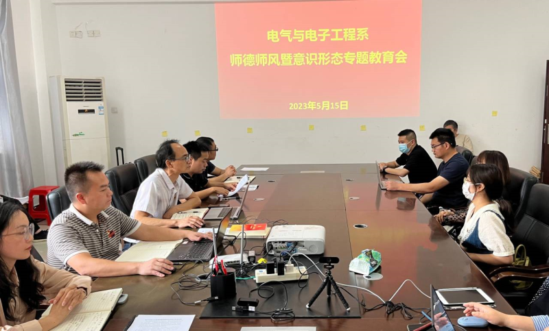 5月15日,电气与电子工程系在4208教室召开师德师风暨意识形态专题教育会,系部班子成员及全体教职工参加会议,会议由党总支书记甘锦琛主持。