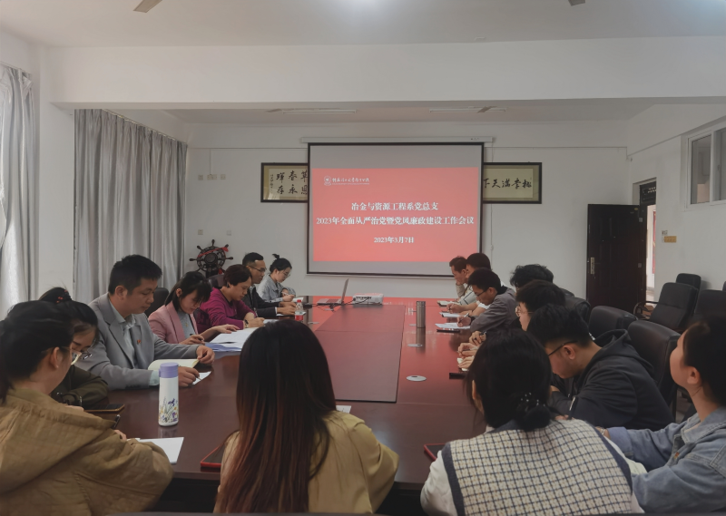 3月7日下午,冶金与资源工程系党总支在探源楼5207会议室召开2023年全面从严治党暨党风廉政建设工作会议,深入学习贯彻党的二十大精神和习近平总书记在二十届中央纪委二次全会上发表的重要讲话精神,布置2023年全面从严治党暨党风廉政建设工作任务。会议由系党总支书记石有总主持,各总支委员、支部委员参加了会议。