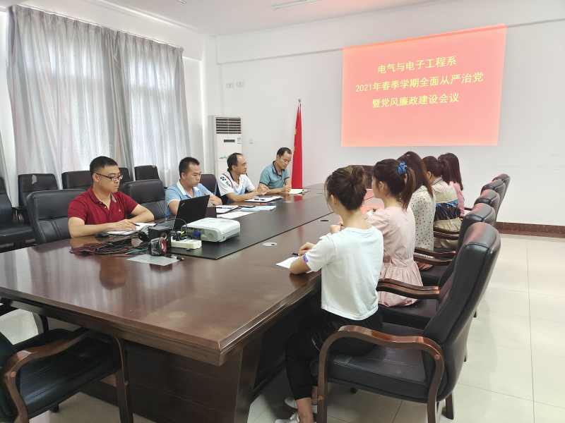 5月19日,电气与电子工程系在4208会议室召开2021年春季学期全面从严治党暨党风廉政建设会议,系部领导班子、全体辅导员及教学秘书参加会议,会议由党总支书记甘锦琛主持。