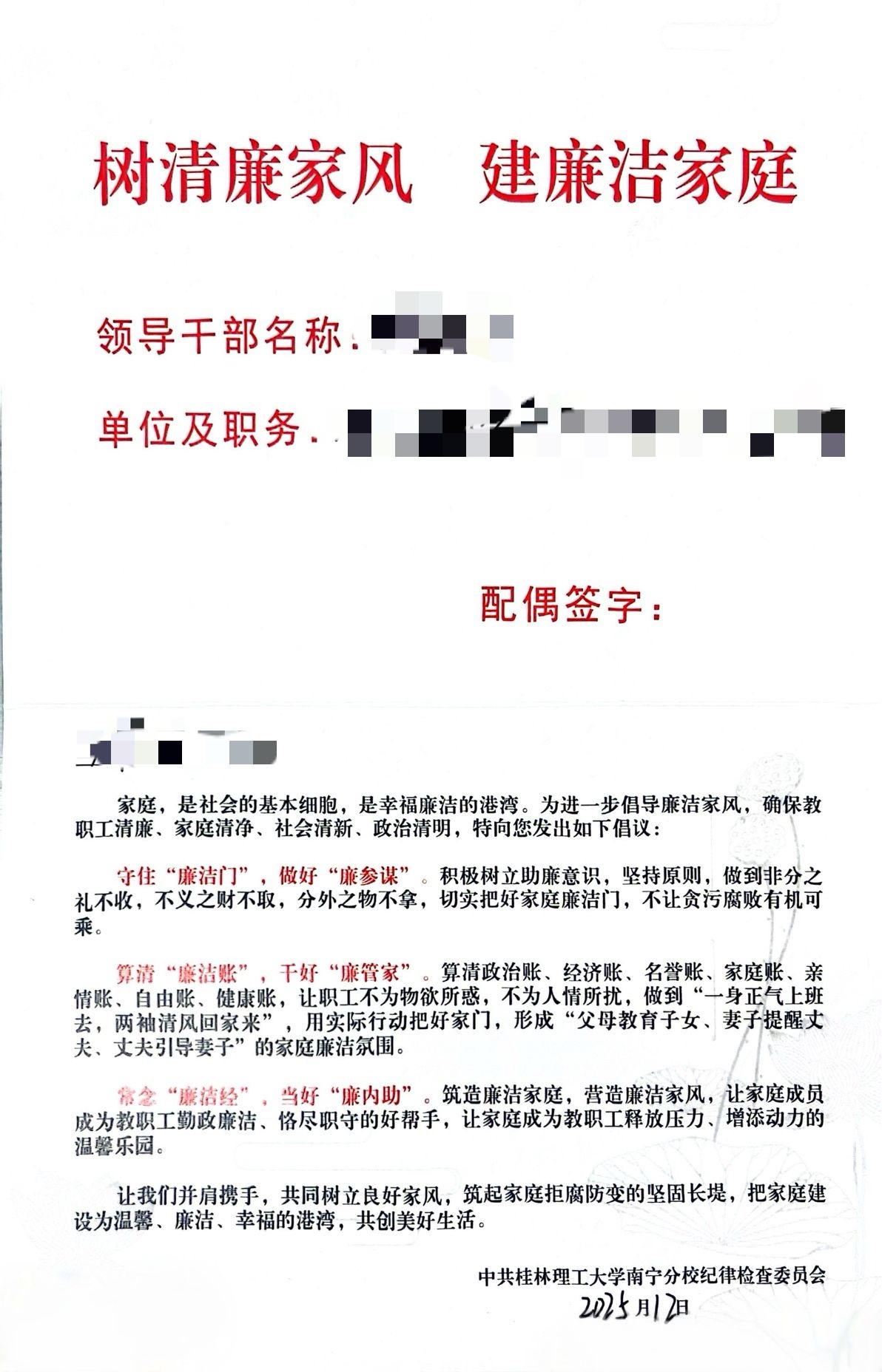 家访中,张树光感谢家属对分校工作的支持,并围绕家庭助廉提三点倡议:一是培育清廉家风,做幸福家庭引领者,通过“知廉、倡廉、守廉”,筑牢家庭反腐堡垒;二是传承清廉家风,做幸福家庭监督者,常吹“廉洁风”警醒初心、防范苗头、鼓舞干劲;三是践行清廉家风,做幸福家庭守护者,常念廉洁“紧箍咒”,助力配偶守住拒腐防变底线。