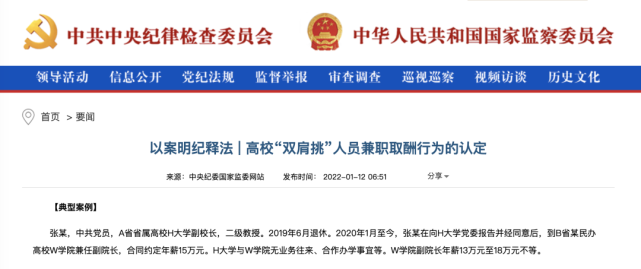 1月12日,中央纪委国家监委网站发布一则关于高校“双肩挑”人员兼职取酬行为是否构成违纪的案例分析。案件中,某省属高校副校长张某在原任职高校退休后,到某民办高校兼任副院长,两高校无业务往来、合作办学事宜等。文章分析认为,对高校“双肩挑”人员的兼职取酬,不能简单套用党政机关领导干部的规定。张某退休后利用其专业技术特长兼职获利,且按规定履行报告程序,不构成违纪行为。
