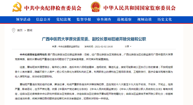 广西中医药大学原党委常委、副校长覃裕旺被开除党籍和公职