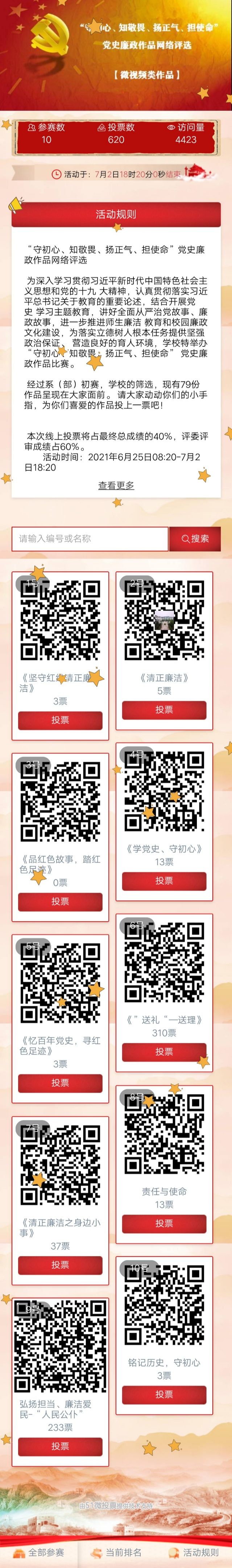 此次活动,耗时三个月,共收到由各系推荐的艺术设计类、绘画类、摄影类、书法类、微视频类五大类共119幅作品,经过初选,挑选83幅作品进行网络评选。网络投票通道浏览量突破10000次,。参赛作品立意新颖、内容健康、文字规范,有较高的思想性和艺术性,具有较高的传播价值。作品紧紧围绕习近平新时代中国特色社会主义思想主旋律,较好地体现全面从严治党、党风廉政建设和反腐败斗争的新形势、新任务;倡导清白处世、拒绝贪腐,公正清廉、依法履职的廉政理念;弘扬秉公用权、刚正不阿,淡泊名利、清正廉洁的优良风气;抨击形式主义、官僚主义、享乐主义、奢靡之风的危害等;传扬崇尚廉洁,用传统文化中的廉洁元素、文化底蕴教育引导广大师生,让师生们接受廉政文化的熏陶,感悟廉政文化魅力。