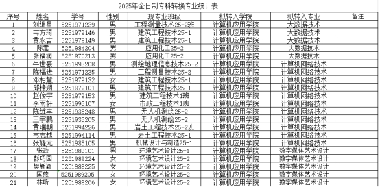 截止2025年12月1日转专业申请报名截止时间,2025级大一集中转专业申请转入计算机应用学院计算机网络技术专业11人,大数据技术专业5人,数字媒体艺术设计专业5人,即共21人申请转入计算机应用学院。