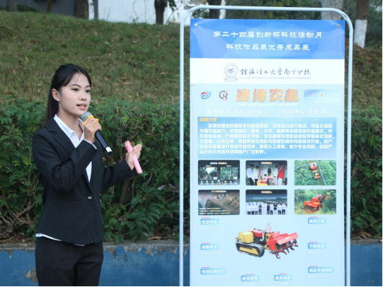 我院本次作品展主要分为六大板块的展览内容:机器狗带来生动的《最炫民族风》歌舞表演、创新大赛项目组成员介绍并展示微耕机油电混合等作业模式、体验多功能一体机进行“桂柳话+壮语”双模态实时转译互动操作、小智AI机器狗语音响应进行动作模仿互动、开放硬件试验箱模拟搭建智能门禁相关原型、获奖手绘稿展示。活动现场氛围浓厚,师生们积极投身各类互动体验,在亲手操作、实时互动中直观感受科技魅力。