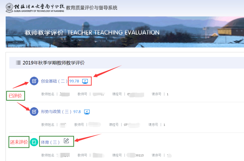 3、务必对本学期所有课程进行评教!如有漏评,将影响在教务系统正常选修下学期课程及本学期期末考试成绩的查询功能(此项约束功能为系统预先设置,因此须在规定时间内完成评教工作);