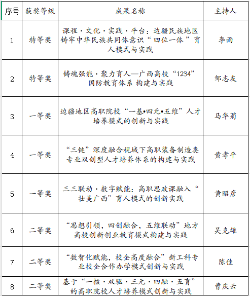 根据自治区教育厅、自治区人社厅《关于组织开展2025年广西职业教育自治区级教学成果等次评定工作的通知》(桂教职成〔2025〕29号)精神及学校教学成果等次评定工作的有关要求,学校组织开展了2025年职业教育教学成果奖评定工作。经个人申请,教务管理部形式审核,校外专家评审,现将获奖名单予以公布(详见附件)。