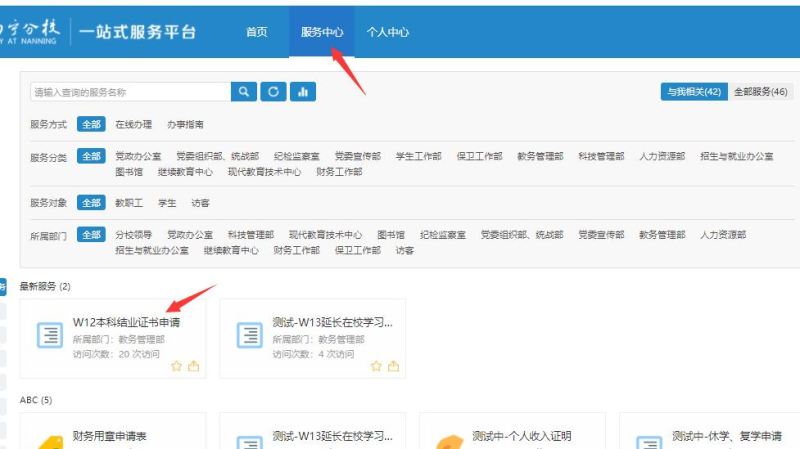 5. 进入服务中心,在下方找到《本科结业证书申请表》,填写信息,提交申请。