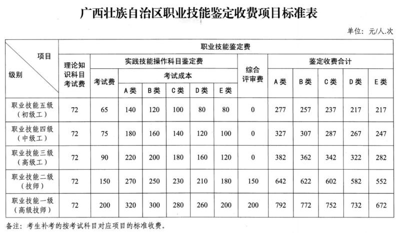 根据《广西壮族自治区职业技能鉴定职业(工种)分类表》、《广西壮族自治区职业技能鉴定收费项目标准表》文件规定,调酒师为B类工种,四级、五级鉴定费分别为:307元、257元,收费标准如下: