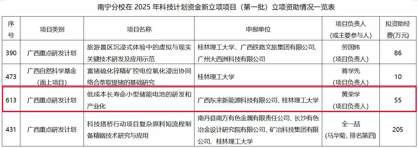 近日,自治区科技厅下文公布了2025年科技计划资金新立项项目(第一批)的通知。其中,我院院长黄荣学作为项目负责人主持申报的广西重点研发计划《低成本长寿命小型储能电池的研发和产业化》(项目总资助55万元)获立项资助。