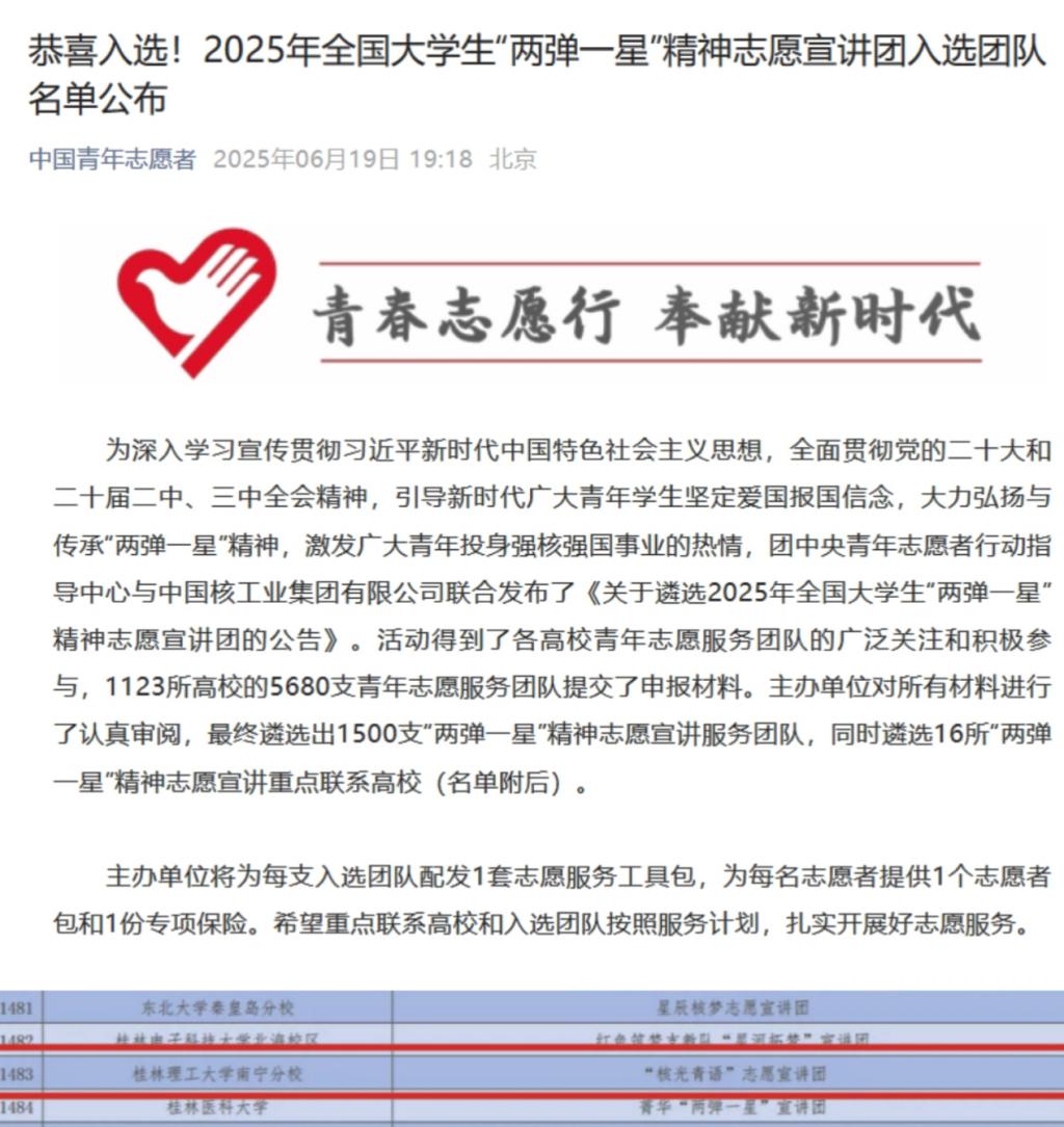 近日,我院“核光青语”志愿宣讲团成功入选2025年全国大学生“两弹一星”精神志愿宣讲团名单。该名单由团中央青年志愿者行动指导中心与中国核工业集团有限公司联合公布。