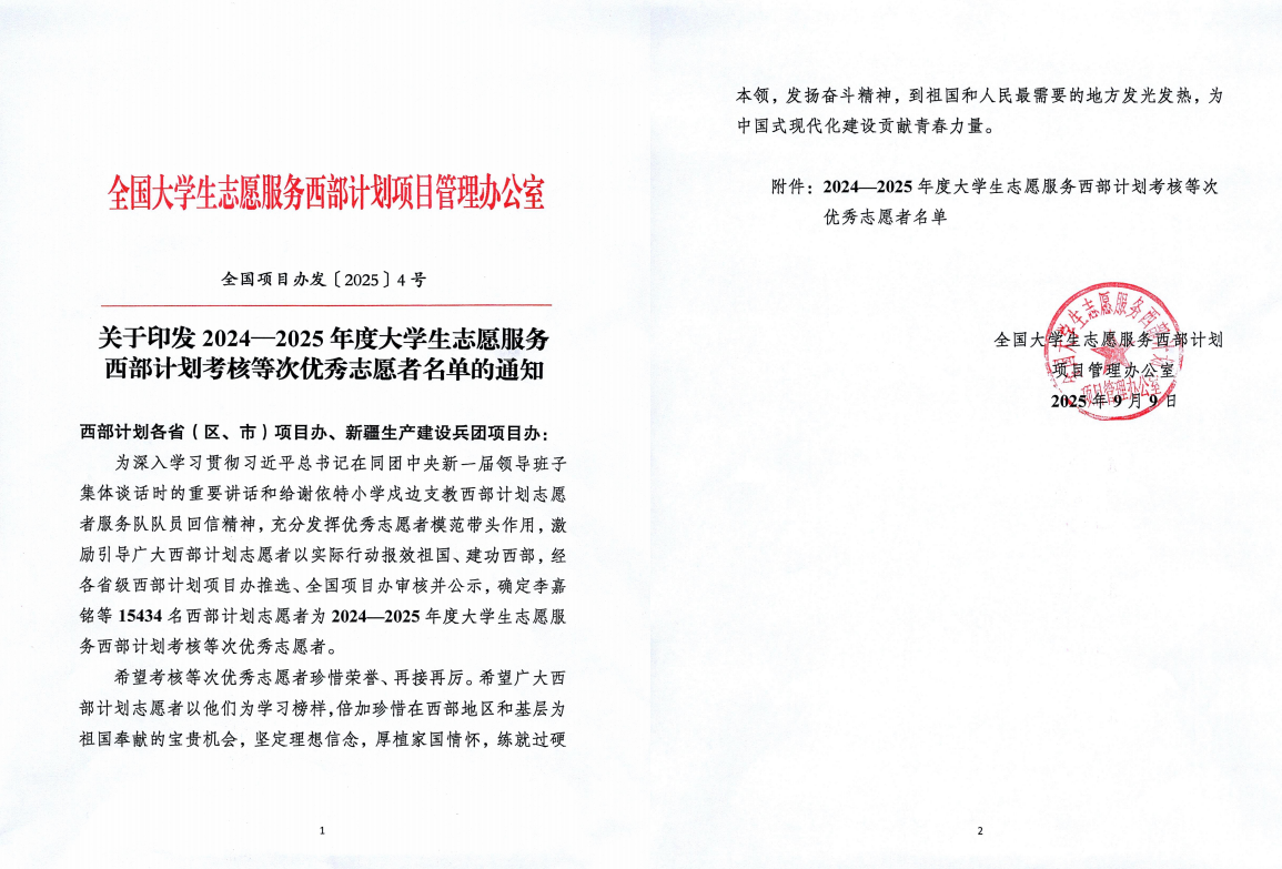 近日,全国大学生志愿服务西部计划项目管理办公室印发了《关于印发2024—2025年度大学生志愿服务西部计划考核等次优秀志愿者名单的通知》。我院2023届毕业生周梦雪获评2024—2025年度大学生志愿服务计划考核等次优秀志愿者。这是她自参加志愿服务以来,连续第二年获得此项年度最高评价,以坚韧不拔的毅力和持续出色的表现,生动诠释了新时代青年的责任与担当。