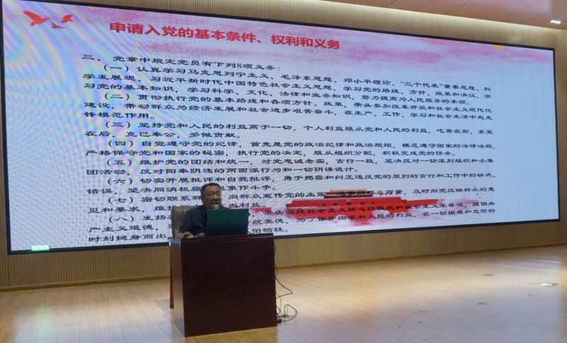 课上,谢晓明书记主要围绕对中国共产党的认识、为什么要加入中国共产党、怎样加入中国共产党三个方面,重点讲解了党的光辉历程、党员发展程序及要求、入党申请书和思想汇报的撰写格式等。同时,谢书记勉励同学们要积极递交入党申请书,主动向党组织靠拢,要胸怀报国之志,努力学习本领,将来报效祖国。