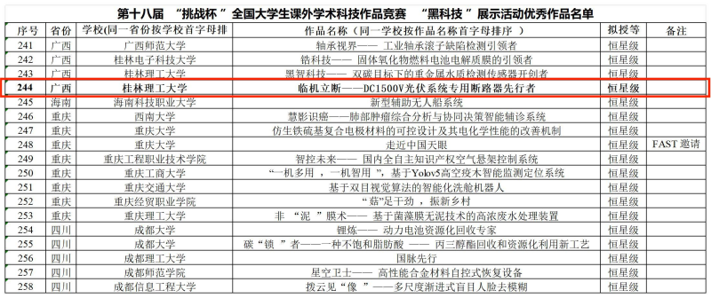 据悉,“挑战杯”全国大学生课外学术科技作品竞赛由共青团中央、中国科协、教育部、中国社科院、全国学联同主办的一项具有导向性、示范性和群众性的全国竞赛活动,每两年举办一次,被誉为当代大学生科技创新的“奥林匹克”盛会。“黑科技”专项赛作为“挑战杯”新设赛道,主要围绕解决“卡脖子”问题,寻找针对前沿领域,具有高精尖色彩或能改变人们生产生活方式或对现有科技成果具有一定颠覆性、超越性的实物或者技术,旨在进一步培养大学生科创意识和能力,促进青年大学生努力成长为科技强国建设的生力军。本届国赛共有99件作品评定为“星系”级作品、181件作品评定为“恒星”级作品、267件作品评定为“行星”级作品、330件作品评定为“卫星”级作品。其中,广西共有15项作品获奖(“星系级”1项,“恒星级”4项,“行星级”4项,“卫星级”6项)。