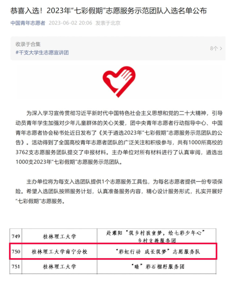 近日,团中央青年志愿者行动指导中心、中国青年志愿者协会秘书处公布了2023年全国大学生“七彩假期”志愿服务示范团队名单,我系“彩虹行动,成长筑梦”志愿服务队成功入选。