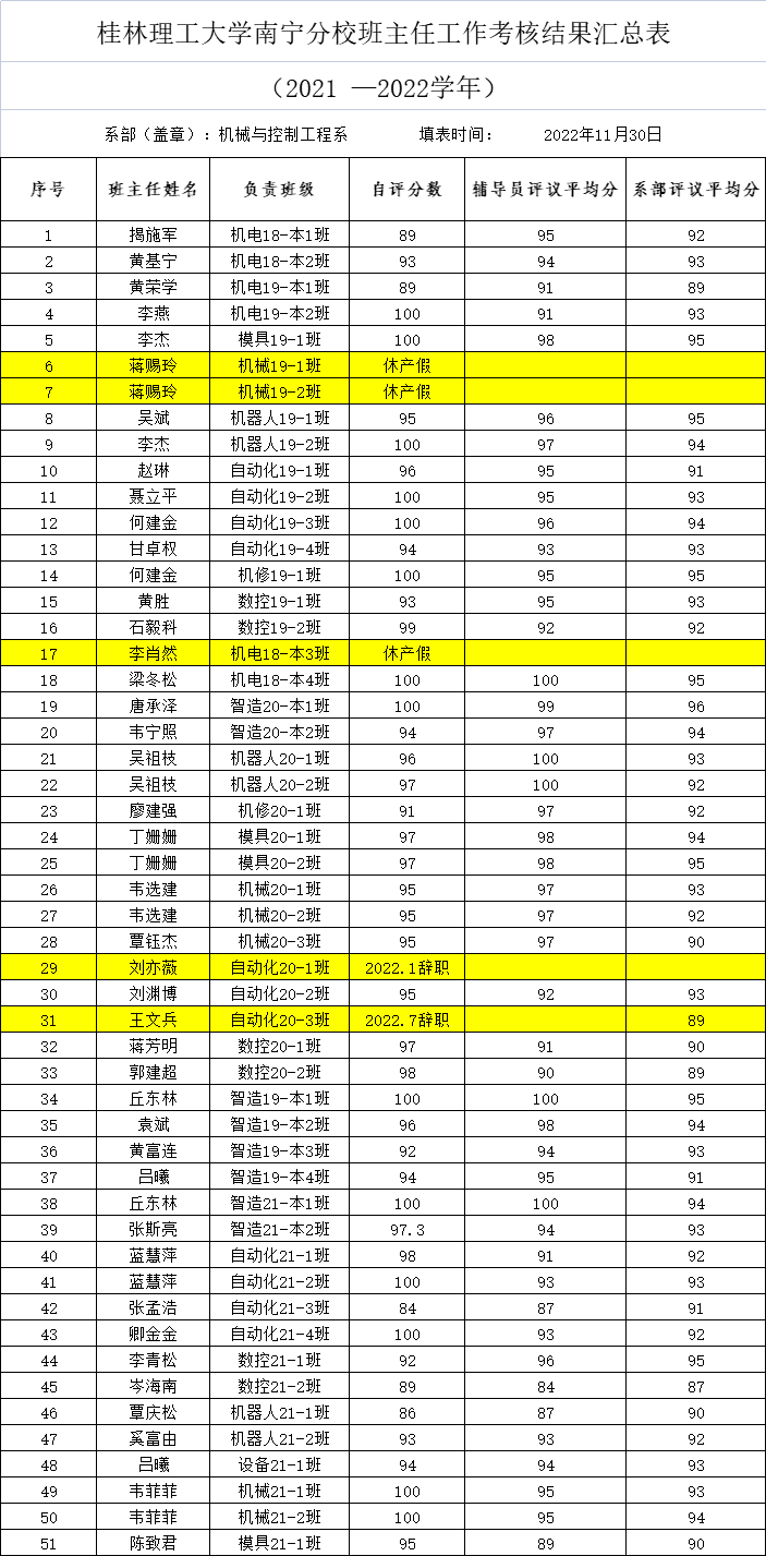 根据《桂林理工大学英国上市公司365班主任工作管理办法》(桂理工南分校学〔2016〕3号)和《桂林理工大学英国上市公司365班主任工作年度考核实施细则》(桂理工南分校学〔2016〕4号)的文件精神,经班主任个人自评、辅导员评议、系部评议。现将打分结果进行公示,公示期为2022年11月30日至12月2日,如有异议,请于公示期内向李杰老师反映情况。 联系人:李杰 联系方式:0771-5075920 附:考核打分结果: