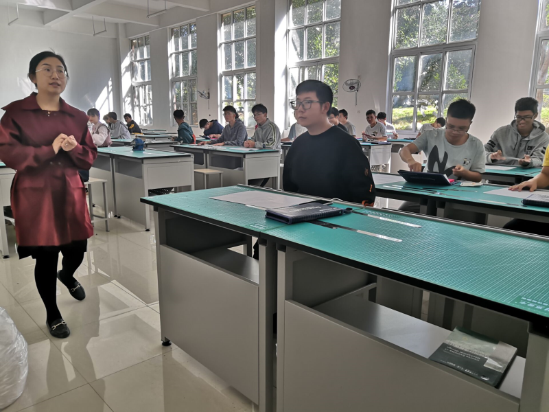 首先,由王丽萍老师为大家讲解比赛规则,随后比赛正式开始,参赛选手熟练的取出制图用具,在A3图纸上迅速画了起来,比赛选手们仔细思考,以合理的方式画出自己的作品,随着比赛的进行有的选手盯着赛题若有所思,锁紧眉头,表情严肃起来;有的选手神态自然,有条不紊地挥动着自己的铅笔,选手们或站立绘画,或坐着思考。在充满着点与线的世界里,所有人都专心于自己手上的图纸,力求画出令自己满意的作品。