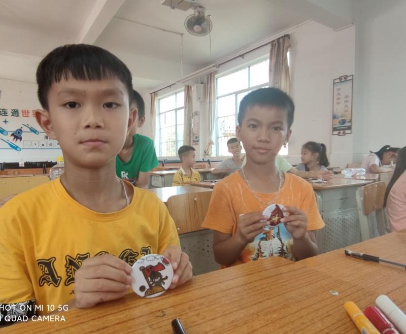 图为小朋友展示自己所制作的红色主题徽章 李莹摄
