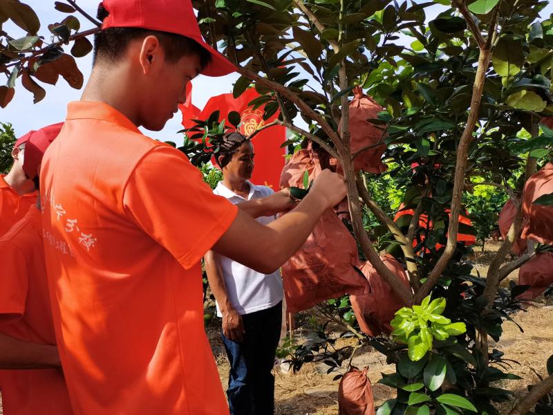 图为实践团成员学习套袋技术 李莹摄