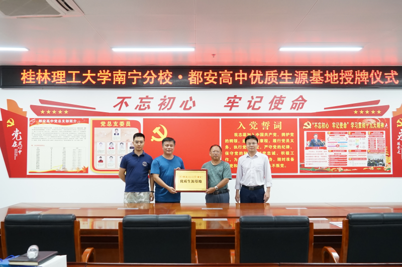 6月24日下午,机械与控制工程系党总支书记袁斌、专任教师蒋芳明及学生年度优秀人物黄福耀一行三人代表学校赴都安县都安高中进行座谈交流,并举行 “桂林理工大学(南宁)优质生源基地”授牌仪式。