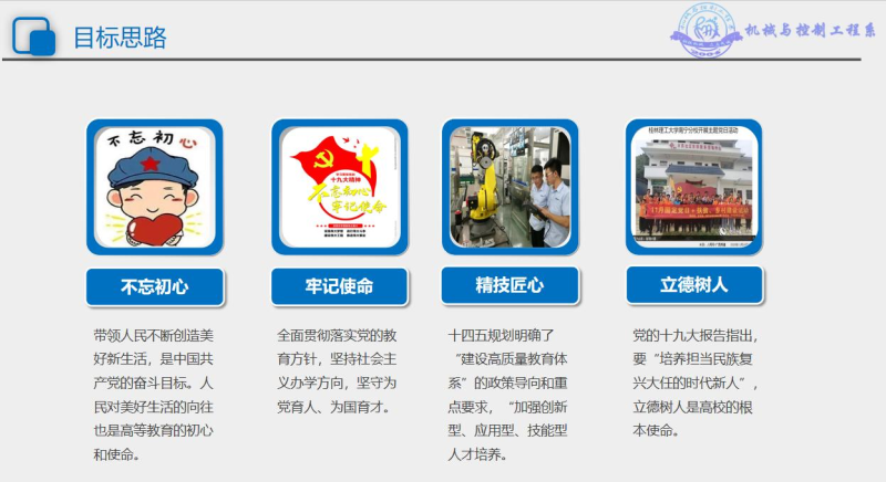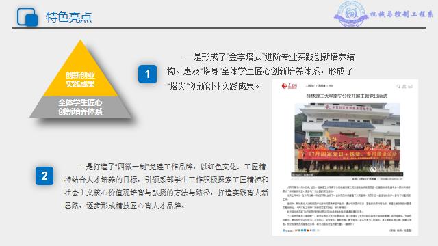 机械与控制工程系为全面贯彻落实中共中央、国务院《关于加强和改进新形势下高校思想政治工作的意见》以及中共教育部党组关于印发《高校思想政治工作质量提升工程实施纲要》的文件精神,以《桂林理工大学“三全”育人示范校建设项目总体方案》为建设指导,以实践育人、精技匠心推动产教融合、协同发展为主线,以“科技活动月”为活动依托,打造“实践创新创业”一体的产教深度融合平台,创建“三对接、三进阶”学生创新创业教育成长体系,面向机械系八大专业全体学生,通过人才培养模式改革,教学方法手段革新,进行创新创业培养,打造精技匠心人才。