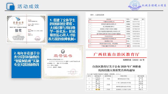 2. 每年开设基于分类分层因材施教的“智能制造班”实施专业实践创新教育,2020年周根同学获广西职业竞赛区3等奖一项。