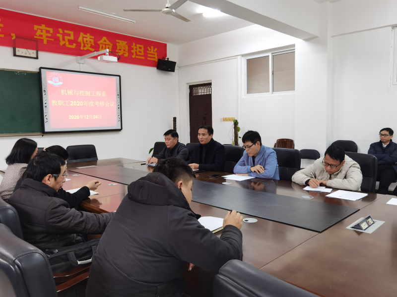 12月24日,机械与控制工程系在3205会议室召开了2020年度教职工考核述职大会,分校党委副书记唐承泽参会并做总结发言,会议由系党总支书记袁斌主持,机械系主任黄荣学、副主任甘卓权、系党总支副书记李杰与会。