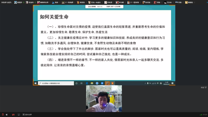 为了响应以分校心理健康教育四级网络工作体系为依托开展工作的号召,增强广大青年对新型冠状病毒感染的肺炎疫情防控心理知识的了解及疫情防控能力,加大新型肺炎疫情防控心理知识宣传的力度,扩大疫情防控心理知识宣传教育的影响,提高其整体疫情防控心理健康知识水平。我系全体在校班级召开“疫路同心,关爱生命”为主题的宣传教育班会。班会是以线上和线下相结合的形式开展,通过本次主题班会,增强了全体学生疫情防控意识,配合学校管理,拥有顾全大局的意识,同时积极调整心理健康状况,加强身体的锻炼,适应当前环境,做好人生规划,为献身社会主义做好准备。