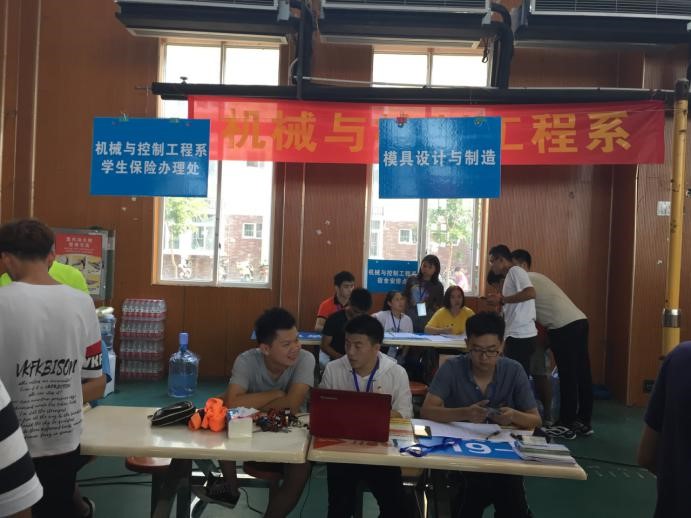 今早跟往常不太一样,一大早就有许多新生来到体育馆,在报到的一旁,设有行李存放区,放置新生行李,有志愿者专门看管,等新生完成报到。一志愿者接一新生,引领他们找到自己所属的班级,带他们到体育馆一楼购买军训用品,顶着烈日接送新生到分配好的宿舍。
