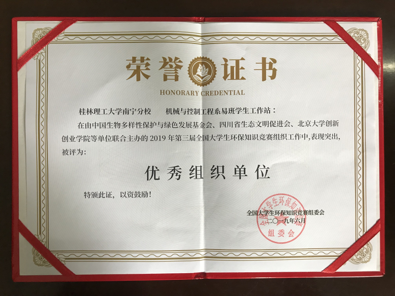 桂林理工大学空港校区机械与控制工程系易班学生工作站在全国大学生环保知识竞赛中积极参与且积极宣传环保的重要性,在全国千余所高校协办单位组织工作中,表现突出,成绩优异,荣获大赛“优秀组织单位”