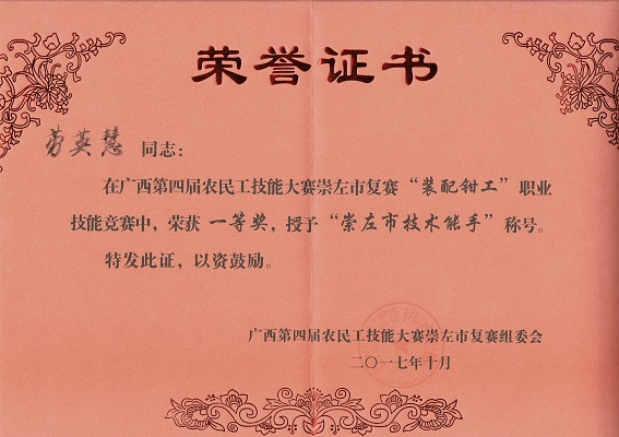 比赛当天各个参赛选手挥汗如雨、奋力拼搏,经过一天激烈的角逐和竞争,我系师生在装配钳工比赛项目成绩优异,劳英慧获得一等奖并被授予“崇左市技术能手”称号,奚富由、石毅科分别获二、三等奖。接下来,劳英慧、奚富由将代表崇左市参加广西第四届农民工技能大赛装配钳工决赛,争取更好的成绩。