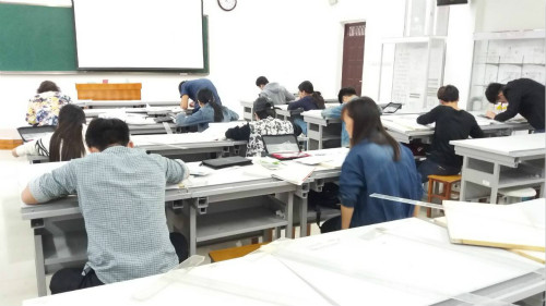 比赛在14:30分准时开始,参赛的同学们争分夺秒,考场上除了选手们画图时铅笔和图纸摩擦声之外很少能够听到多余的杂声,然而在这种紧张的氛围中,同学们没有手忙脚乱,冷静的绘制着自己的作品,双眼紧盯着手中的尺子,生怕看错了尺寸,因为这是一场细节决定成败的比赛,失之毫厘差之千里。所以需要十分的专注,不然成功也许就与自己擦肩而过。