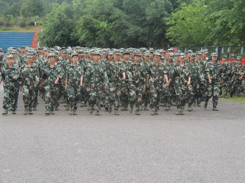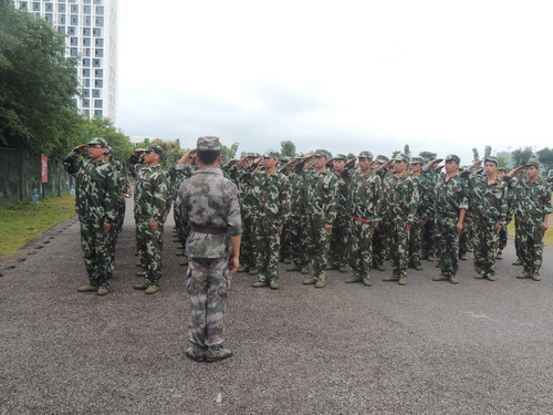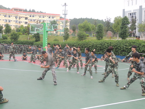 教官训练同学们队列行进、停止间转法、蹲下、敬礼和捕俘拳,强调动作要领并示亲自范标准动作,对每一位同学的动作进行纠正。教官在鼓励同学们的同时,并旁边的连队进行对比,这种方法很巧妙地激发了同学们的斗志,使得同学们训练更有激情更加认真,当听到教官的称赞时都不由自主的为自己鼓掌,同样,当看到其他排做的更标准时也会为他们拍手叫好。训练场上一声胜过一声嘹亮的口号如潮水般接连不断。