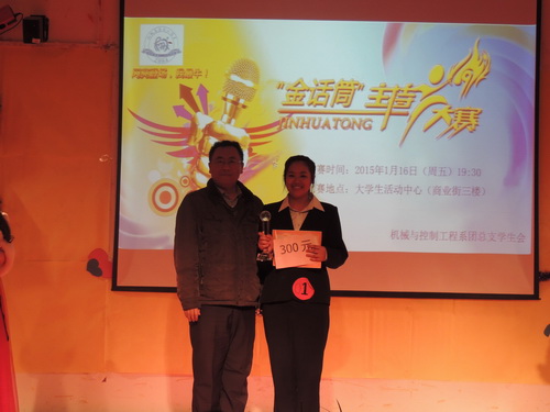 “金话筒”主持人大赛旨在为大学生提供一个展示与提升自我的舞台,为热爱主持的学生提供交流的机会。与第一届比赛相比,这次比赛竞争更为激烈,通过初赛的层层选拔,最终有12位选手脱颖而出进入决赛。大赛主要分“我行我秀”、“即兴搭档”和“个性概述”三个环节。在第一环节中,参赛选手们通过自己的才艺来简单的介绍自己,在“即兴搭档”中参赛选手通过抽签形成两人一组,每组分别主持体坛快讯、新闻播报、少儿节目等6个节目。通过前两轮的激励角逐,最终岩土14-1班南瑞、会计13-6班赵博森和旅管14-1班李星汉分别荣获“金话筒”、“银话筒”和“铜话筒”。在最后一个环节中,剩下的9名参赛选手上台为自己进行拉票,决出“最佳人气”和“最佳台风”的奖项。