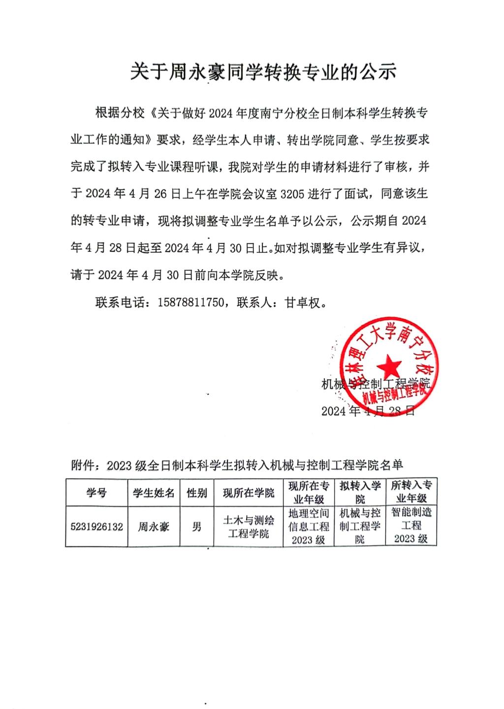 关于周永豪同学转换专业的公示