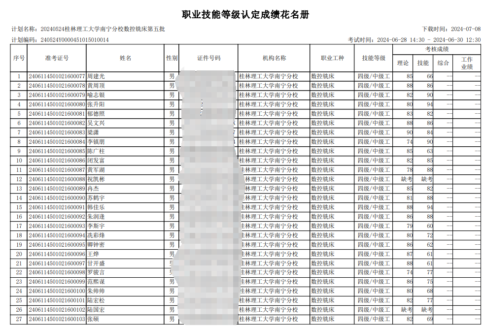 机械与控制工程学院于2024年6月28日-6月30日开展了2024年第五批次职业技能等级认定考试。本批次认定考试数控铣工29人共29人。现将考试成绩公布如图,公示时间7月1日至7月5日。