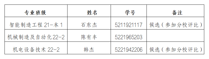 根据上级和学校有关文件要求,我院2023-2024学年度国家奖学金院内推荐工作已经完成,经学生个人申请,班主任、辅导员推荐,我院国家奖助学金评审小组研究决定,拟推荐本科候选学生1名参加分校评比、专科2两名(其中候选学生1名参加分校评比)。现将我院拟推荐名单公示如下: