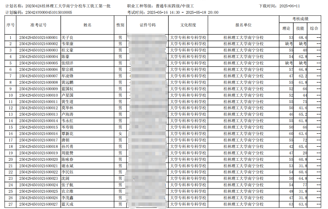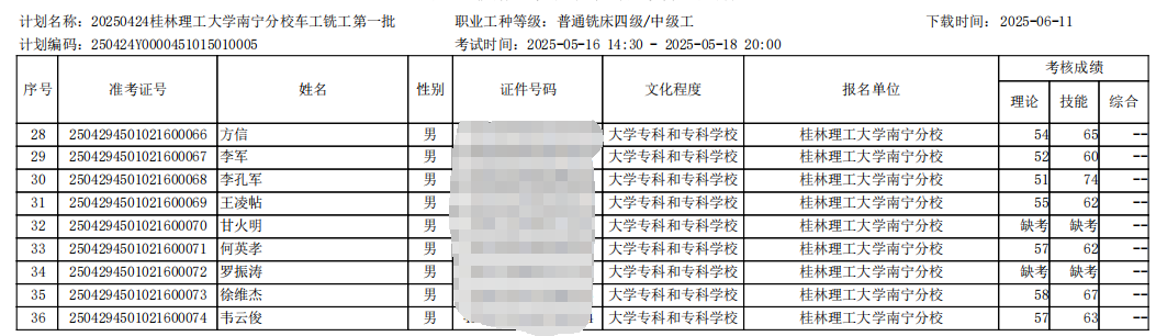 我学院于2025年5月16日-5月18日开展了2025年第一批次车工铣工中级职业技能等级认定考试。本批次认定考试铣工中级36人,车工中级38人。现将考试成绩公布如图,公示时间5月20至5月28日。