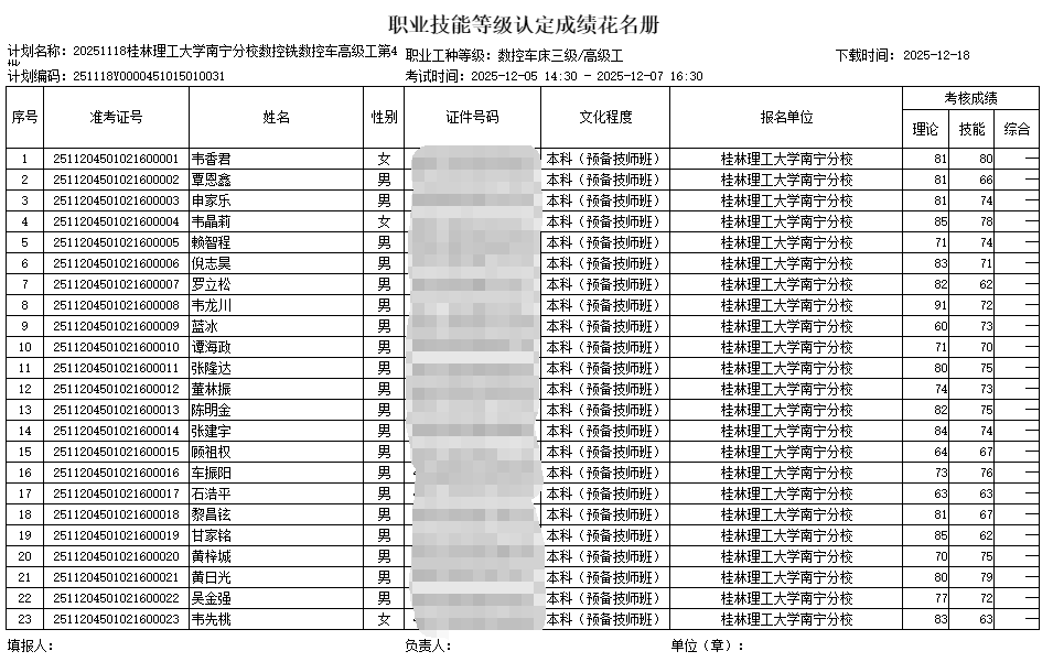 我学院于2025年12月05日-12月07日开展了2025年第四批次数控车床、铣床高级职业技能等级认定考试。本批次认定考试铣工高级35人,车工高级23人。现将考试成绩公布如图,公示时间2025年12月10日至12月17日。