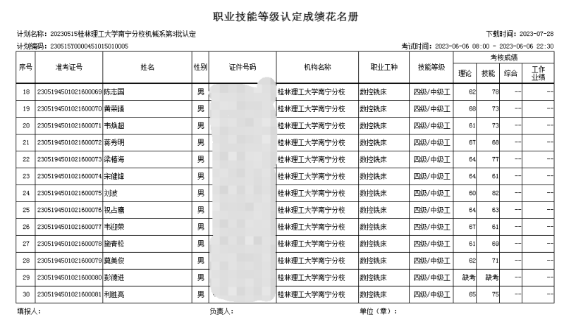 我系于2023年6月6日开展了2023年第三批次职业技能等级认定考试。本批次认定考试数控铣工18人,数控车工12人共30人,合格率100%。现将考试成绩公布如图,公示时间6月15至6月20日。