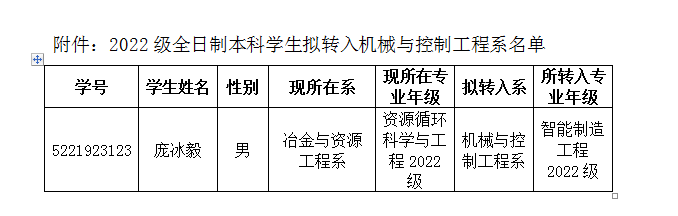根据分校《关于做好2023年度英国上市公司365全日制本科学生转换专业工作的通知》要求,经学生本人申请、转出系同意、学生按要求完成了拟转入专业课程听课,我系对学生的申请材料进行了审核,并于2023年6月15日在机械系会议室进行了面试,同意该生的转专业申请,现将拟调整专业学生名单予以公示,公示期自2023年6月16日起至2023年6月19日止。如对拟调整专业学生有异议,请于2023年6月19日前向本系反映。