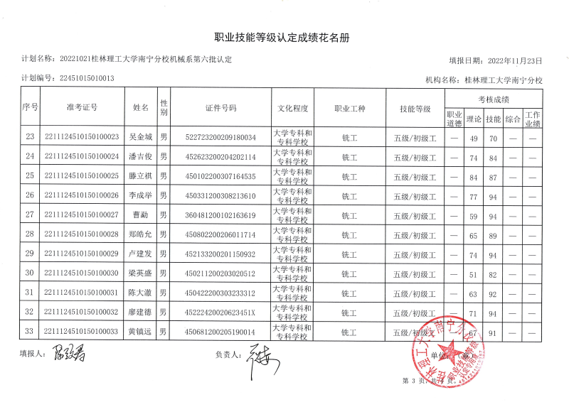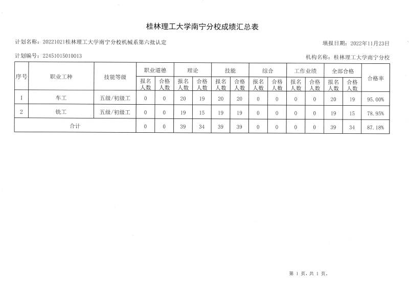我系于2022年11月12日开展了2022年第六批次职业技能等级认定考试。本批次认定考试车工20人,铣工19人共39人,合格率87.18%。现将考试成绩公布如图,公示时间从11月24至11月30日。