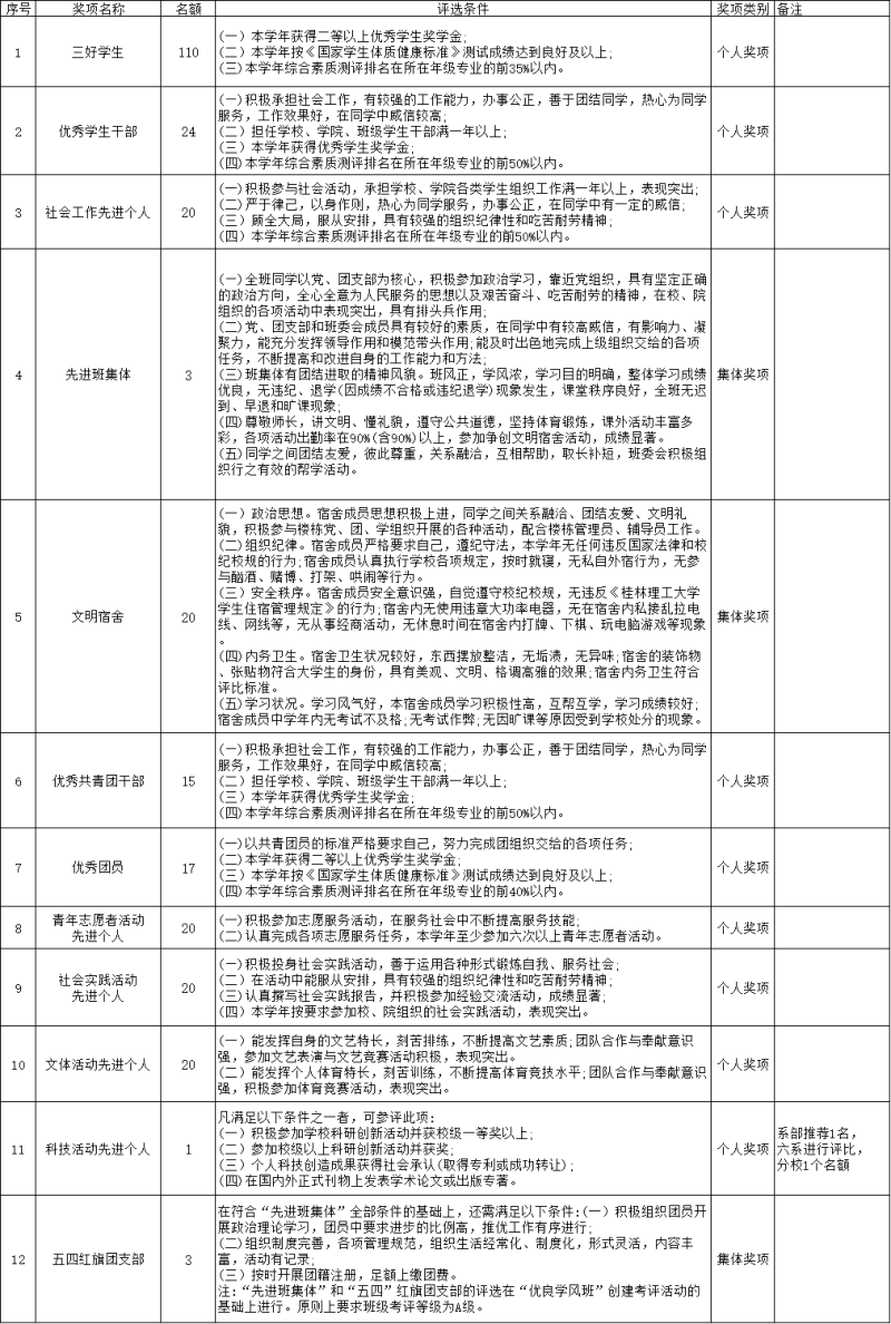 参与三好学生、优秀学生干部、优秀共青团干部、优秀团员、科技活动先进个人、文体活动先进个人、青年志愿者活动先进个人、社会实践活动先进个人、社会工作先进个人先进个人奖项的请填写《桂林理工大学学生先进个人申请审批表》(附件1),经班主任、系部、分校审核评选产生。每个人最多获评两项个人奖项。
