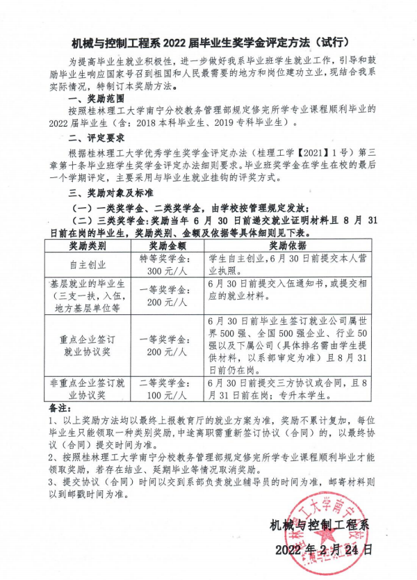 关于做好机械与控制工程系2022届毕业生奖学金评选工作的通知