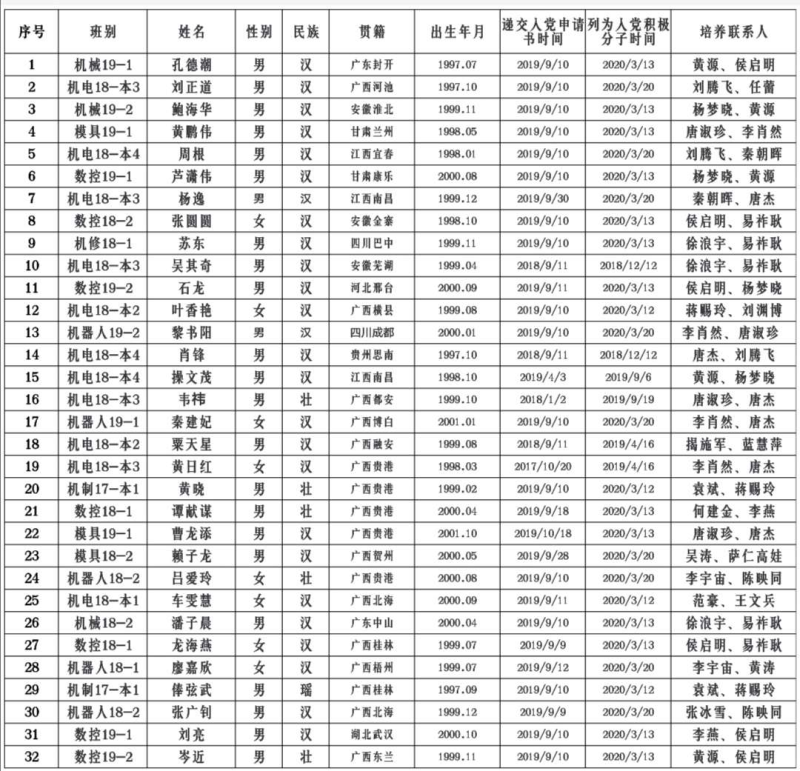 经各支部委员会研究同意,将孔德潮等32名同志列为发展对象人选。根据发展党员工作有关要求,现将其有关情况公示如下: