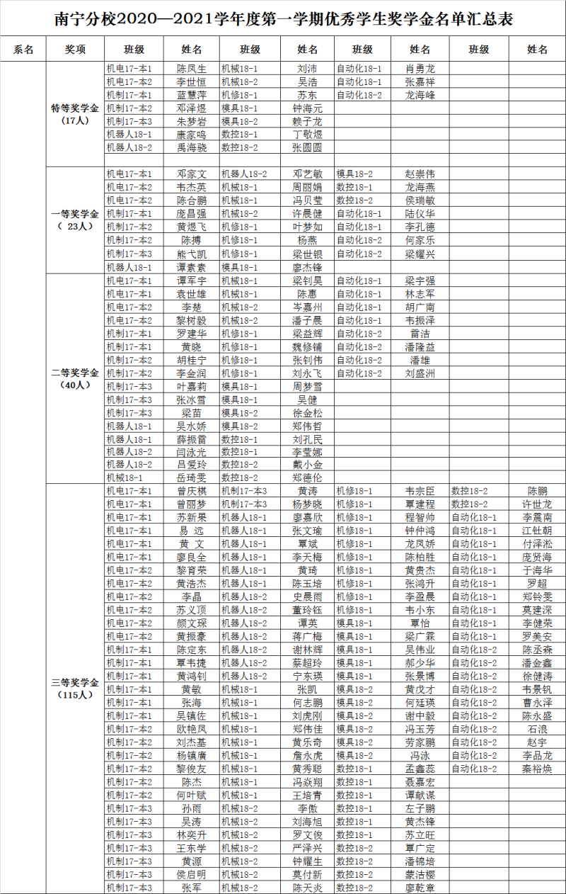 根据《关于做好2021届毕业生2020—2021学年度第一学期优秀学生奖学金评选工作的通知》的文件精神,我系严格按照文件要求与流程组织开展了评选工作。经2021届毕业生个人申请,系部对照优秀学生奖学金评选条件、结合毕业生在校表现,对申请者进行了综合审议,拟推荐陈凤生等195名毕业生为2020—2021学年度第一学期优秀学生奖学金候选人选(具体名单见下图),请各班学委于27日早12点前,填写《附件3:英国上市公司3652020-2021学年度第一学期优秀学生奖学金发放表》《附件4:桂林理工大学英国上市公司365优秀学生奖学金评定审批表》(详见附件)并以“班级”重命名后发至机械系学习部邮箱:664074952@qq.com.