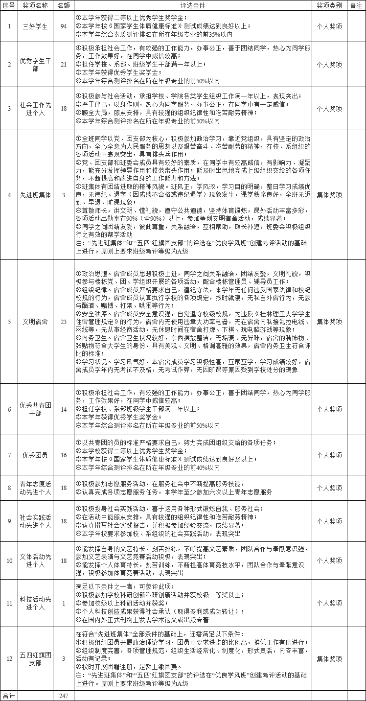 参与三好学生、优秀学生干部、优秀共青团干部、优秀团员、科技活动先进个人、文体活动先进个人、青年志愿者活动先进个人、社会实践活动先进个人、社会工作先进个人先进个人奖项的请填写《桂林理工大学学生先进个人申请审批表》(附件1),经班主任、系部、分校审核评选产生。每个人最多获评两项个人奖项。