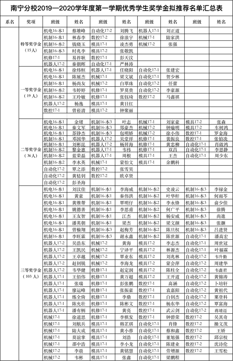 根据《关于做好2020届毕业生2019—2020学年度第一学期优秀学生奖学金评选工作的通知》的文件精神,我系严格按照文件要求与流程组织开展了评选工作。经2020届毕业生个人申请,系部对照优秀学生奖学金评选条件、结合毕业生在校表现,对申请者进行了综合审议,拟推荐蔡雄峰等173名毕业生为2019—2020学年度第一学期优秀学生奖学金候选人选(具体名单见下图),请候选人员于20日晚10点前,填写《附件3:英国上市公司3652019-2020学年度第一学期优秀学生奖学金发放表》《附件4:桂林理工大学英国上市公司365优秀学生奖学金评定审批表》(详见附件)并以“班级+姓名”重命名后发至机械系学习部邮箱:2675167762@qq.com.