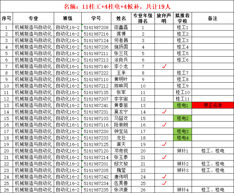 根据《自治区教育厅关于做好2019年全区高校优秀高职高专生选拔升本工作的通知》(桂教高教〔2019〕21号)、《桂林理工大学2019年选拔优秀高职高专学生进入本科学习实施细则》精神和分校2019年选拔优秀高职高专生进入本科学习实施细则的要求,经个人申请、系部资格审核,系部进行名单公示。公示期间,仅收到自动化16-2班意见反馈,其他班级对公示名单无反馈意见。现机械制造与自动化专业升本更正名单进行公示,其他专业不变。公示时间:5月4日-5月5日。